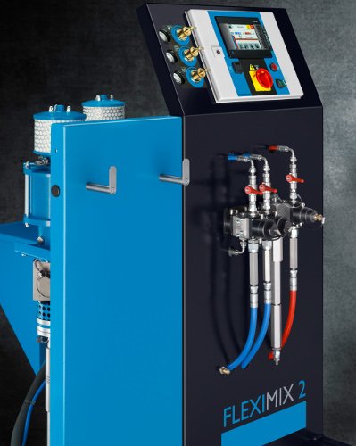 Leistungsstarke 2K-Airless Farbspritzanlage. Mit wenigen Handgriffen kann die Anlage, durch den Austausch der Härterpumpe, ohne Auslitern oder Justieren auf andere Mischungsverhältnisse umgestellt werden.